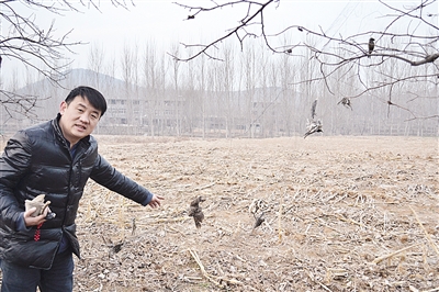 1月15日下午,记者在薛城区沙沟镇曹沃村采访时看到,村子北头地边的几棵小树间,一张残破的网子上,竟然挂着十多只早已干透的猫头鹰、喜鹊、白头翁等,非常令人痛惜。在不远处的曹沃古墓顶上,几棵槐树间同样是挂着一个用来捕鸟的网子。一位村民告诉记者,该村周围都是山,绿化也很好,吸引了很多鸟类在此安家,因此有不法村民利用网子捕鸟,之后送到饭店充当野味,实在是不应该。 (记者 孔浩 摄)