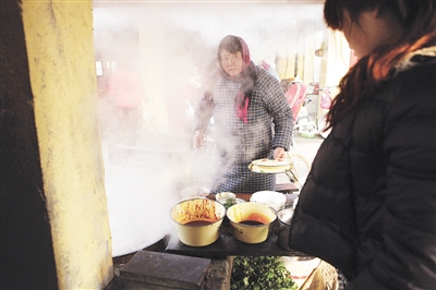 来赶集的人对“丸子汤”一定不会陌生,丸子汤是不少中老年人记忆中过年时才能吃到的美味佳肴。丸子汤的制作也是一门手艺,把炸好的丸子迅速放入调好味的汤锅中,等丸子刚刚吸收到汤汁,表面依旧酥脆的时候捞回碗里,然后依据口味,加入辣椒面、醋、香菜和蒜苗,就可以端上桌供食客们享用了。一碗丸子汤配上刚出炉的火烧,如果再加点熟猪肉或者狗肉,那就更过瘾了。