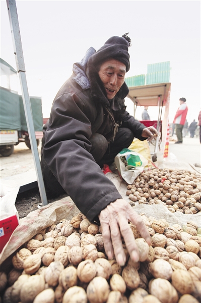 年逾八旬的李老汉骑着电动三轮,从山亭韩庄带着100多斤自家种的山核桃来卖。他说:“这些山核桃中午12点的时候就能卖完,还不耽误回家吃午饭。”在外打工的孙先生一回到家便将家里的棉花、花生等干货带到集市上来卖,大花生3.5元一斤,小花生5.5一斤。孙先生说,自家种的山货总能吸引来南石镇赶集的城里人。