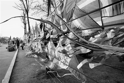 雪后初晴,造型各异的风筝就出来“争奇斗艳”了,卡通的、涂鸦的、彩虹的,还有京剧脸谱的,五颜六色的风筝在光明广场上形成了一道道风筝墙。