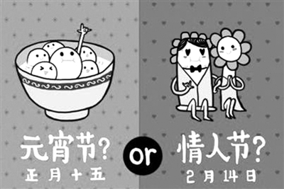 今年的元宵节恰好与西方的情人节撞车,两个节日碰到一起原本是喜上加喜,但是就是这个双喜临门的节奏却让很多人犯了愁。究竟是捧着玫瑰陪情人吃巧克力,还是回家与家人团聚看晚会呢?
