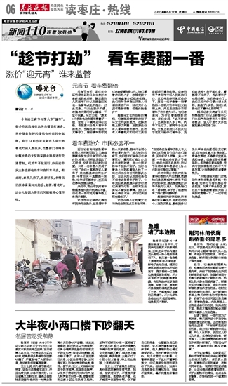 元宵节当天,家住市中区明湖社区的马女士拨打本报新闻热线反映,解放路的几家超市门口以及医院和其他一些看车点趁机涨价。对此现象,马女士表示不满,希望有关部门可以重视一下这个问题。马女士说:“原本1元钱的电动车看车费翻了一倍,变成了一辆电动车2元钱。有些原本没有人看车子的地方,当晚也有一些老太太蹲守了,看到停车的市民过来就要看车费2元。她们看着来玩的人多,就随便搬个小板凳拿着小红纸来收钱。我们把车子停在公共的人行道和商店门口,她们凭什么说收费就收费,说涨价就涨价?”