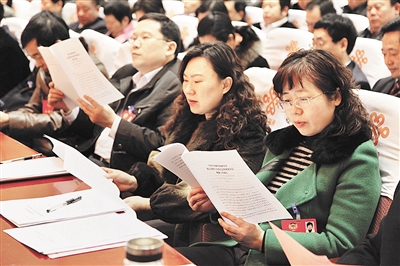 市政协委员们在认真聆听市政协副主席付廷安作的政协第九届枣庄市委员会常务委员会提案工作报告。