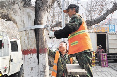 2月19日,市中区园林管理处的工作人员,正在对被夜间驶进城区的货车撞裂的法桐树进行铁箍加固。 (记者 王震 摄)