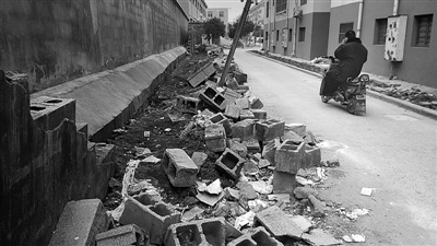 近日,在薛城区鑫源小区1号楼的南侧,堆积了不少散落的空心砖,长度达到了近30米。据住在此处的居民介绍,之前这里都是好好的围墙,去年下大雨时将围墙冲垮,这么长时间来一直无人进行修理。现在连旁边看似完好的围墙也发生了倾斜,不知为何一直无人对其修理。