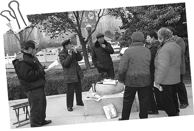 22日下午,在薛城区永兴路沿河公园,几位老年人聚在一起快乐地唱歌。 (记者 王龙飞 摄)