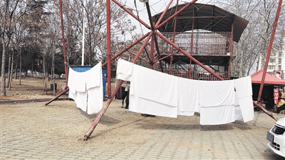 23日,阳光明媚,光明广场上有许多市民在游玩。然而有市民反映,位于光明广场东侧晒着床单被罩,有碍观瞻。“在广场上晒这些床单被罩,实在是大煞风景。”