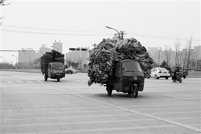 3月1日,记者途经西昌路时,两辆机动三轮车拉载着比三轮车体积大约2倍的货物。满满当当的货物远处看去就像一座移动的小山。这两辆三轮车一路行驶着更是赚足了回头率。“这车让弄成这样,又拉了这么多轮胎就用了一根绳捆着。一会儿到外环路上,万一掉落了可真让人担心啊!”一位市民如是说。