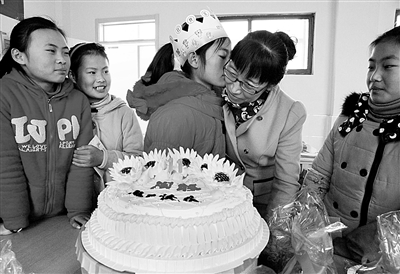 3月7日中午,市中区永安乡聂庄小学的教室里,同学们围在一个大大的蛋糕前高兴地唱着生日歌,11岁的小周想在市中区供电部门工作的孙轶阿姨脸上亲了一下,让大伙非常感动,接着小周想说,她长这么大从没过过生日,去年无心的一句话,今天,帮扶她的孙妈妈就送来了蛋糕。 (记者 孙慧英 摄)