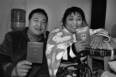做过厨师的张玉海对于做饭很有一套经验,他变着花样做饭菜,董顶青喜欢吃什么他就做什么。由于照顾的体贴入微,原来瘦弱的董顶青很快就胖了一圈,整个人也变得开朗了,心情舒畅了,爱情在悄悄地改变着两人的一切。2011年5月19日,两人走进了市中区婚姻登记处,终于拿到了梦寐以求的结婚证,那一刻,43岁的董顶青和30岁的张玉海紧紧地拥抱在一起,张玉海红着脸说出的那句“将要照顾你一辈子”,让董顶青彻底地感到了踏实。董顶青告诉记者,为了顺利的和她结婚,张玉海一直瞒着家人,丝毫没有透露她身体有残疾的情况,他的家人都还以为他在北京打工呢。前几年她的父亲去世,张玉海同样是尽孝送终,家里的很多事情都是靠着他完成的。为了照顾她,张玉海这些年一直没能回德州老家,可以说,张玉海为她付出了太多,她真的没想到自己竟然是这么有福气,遇到了一个深爱着她的好人。