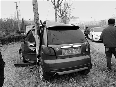 3月11日下午5时左右,一辆小轿车在去枣庄学院的路上撞到了路边的一棵树,左侧的玻璃全部撞碎,驾驶室遭受严重撞击。据目击者称,该车撞树撞得十分蹊跷,因为当时路上并没有多少行人,也没有其他车辆,该车在正常行驶途中,只听一声长长的刹车声,然后转了几个圈之后就撞上了路边的树。据知情人透露,车上的两人是一对情侣,之前就多次说过要去撞树,然后他猜测很可能是两人在车上发生争执,在高速行驶的情况下拉了手刹,所以才会出现撞树的后果,所幸无人员伤亡。