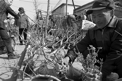 3月18日,记者在利民市场看到,今年春天,传统的花卉苗木并不热销,而金银花盆景却受到市民青睐。家住北庄镇的张先生带来了百余株金银花盆景,销售良好。据说这种金银花三季开花,既能观赏又能入药,所以受到市民的欢迎。