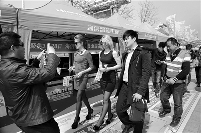 3月23日,市中区光明广场车展上来自某车友会的两位外国美女车友被市民热追,争相与其拍照合影。