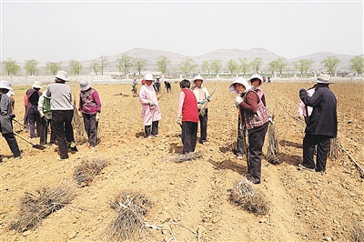3月31日,峄城石榴园南大门附近村民,正在穆拉德农业公司培育石榴苗。耕地被穆拉德农业有限公司征用后,村民们不仅能拿到租金,种植五亩以上达到建园水平,且可以保障成活率的农户,每亩还可获200至400元补助。
