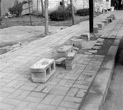 用水泥块支摊子做生意,天黑后,摊子收了却把水泥块留在原处,这样很容易出现意外。近日,家住市中区安庆路的居民王先生向本报反映称,“市中区光明东路锦龙巷北段的人行道上天天有商贩摆摊做买卖,有的商贩为了图省事晚上撤摊后,就把支摊子用的水泥块扔在人行道上,天黑后,不熟悉路况的市民经过此处很容易被这些水泥块绊倒,发生意外。这不,我昨天晚上经过这里的时候,由于天太晚看不清楚,差点被绊倒。”