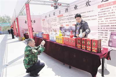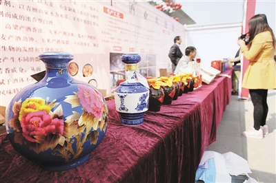 各品牌酒水的工作人员通过设置咨询台、摆放展板、散发宣传资料等方式,热情地向市民宣传酒水的特点及相关内容。诸多爱酒人士也积极地与工作人员交流,询问价格、观看工艺酒瓶等。其中,有两款酒瓶备受市民瞩目,一款是青檀老窖的如青花瓷器的酒瓶,一款是衡水老白酒的高约50厘米的红色葫芦状大酒瓶。一位刘姓市民说:“大老远就看到这两款酒瓶了,里面有酒吗?没有的话,可以把瓶子给我收藏吗?”一位赵老先生看到大帝豪,兴奋地说:“很久没喝到这酒了,以前这可是我最爱喝的酒。现在,年纪大了,酒也不怎么喝了,要是让我投票,我肯定投这款,太有感情了!”一位散步至此的市民看到洋河酒系列时说,他和朋友喝酒时,没少喝洋河的酒,口感不错,此次获奖真是实至名归。