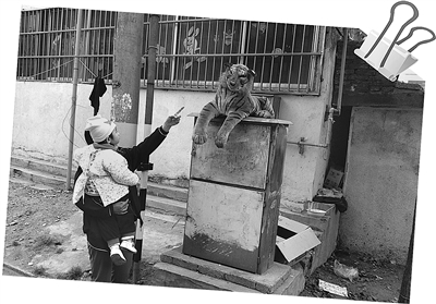 7日,在立新北里55号楼旁,一只毛茸茸的“老虎”蹲坐在电压箱上晒太阳。一位居民抱着2岁的孩子在旁边观看,孩子直喊吓人。