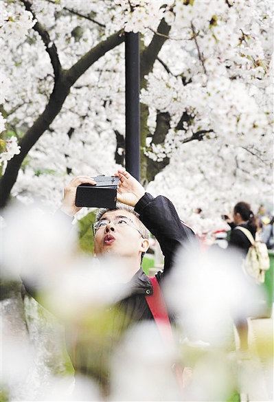| 昨日,游客在青岛中山公园拍摄樱花。近日,青岛市中山公园樱花绽放,盛花期较往年提早一周左右,吸引了众多游客前来赏花、拍摄。据介绍,青岛中山公园樱花种植面积约72万平方米,现有樱花树3000余株。 (新华社) |