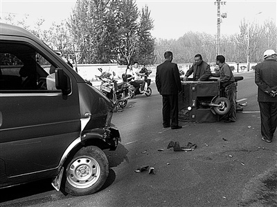 4月8日下午,薛城区永兴路上发生一起交通事故,一辆机动车和一辆电动三轮车相撞。机动车的右前侧损坏严重,而电动三轮车则被撞翻在地,电瓶中的腐蚀性液体流淌至地面,所幸并没有造成人员受伤。