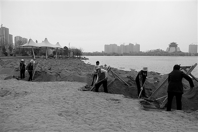 连日来,记者在东湖公园沙滩看到,工人们正在对沙滩进行首次维护。东湖沙滩独一无二,自建成以来,一直是市民休闲娱乐的好去处。 (记者 马高超 摄)