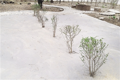 近日,立新小区某栋楼的一住家,将楼前的地面用水泥硬化,准备作为自家的停车场,但这下可苦了几棵去年冬天刚栽上的黄杨树。记者看到,这几棵黄杨的根部被水泥糊住,生长受到极大地限制,并且极有可能随时死去。 (记者 孔浩 摄)