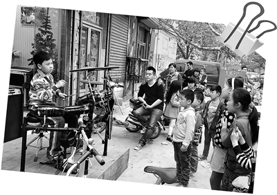 4月10日傍晚,立新小区内的一家儿童打击乐培训学校门前,一名小鼓手忘我地敲打着架子鼓,吸引了许多居民前来观看。