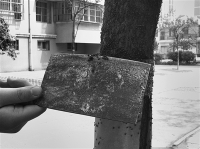 10日上午10点,记者来到该小区,发现居民所反映的滴油行道树主要在小区东门入口处的道路两侧,总共有15棵,其中多数行道树下都有类似油状的液体。液体绝大部分都已凝固,记者用手摸了摸,还是非常的黏手。站在树下,能够感到树上不断有油点飘落。道路南侧中间位置的几棵树的树干上满是黑色小虫,最严重的一棵树上虫子密密麻麻,数量多达数百只。站在一旁,令人毛骨悚然。这十几棵树木最高的约5米,树干直径约为5厘米,站在树下,也能看见部分叶片上的小虫。为了采集样本,记者从一居民处借来一把菜刀,想将树上的树枝砍下,但试了几次后均无果,身上反倒落了十余只黑色小虫,瞬时起了一身鸡皮疙瘩。受到树木滴油的影响,停在树下的一辆白色小轿车车身都覆满了黑色油点,用手指甲也无法将其去除掉。