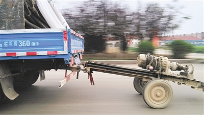 4月13日下午6点40分,在市中区北安西路枣庄学院附近,一辆蓝色货车拖着个简易的双轮车在路上狂奔,时速快时每小时可达60公里,当时天色已晚,跟在后方的车辆均不敢靠得太近。
