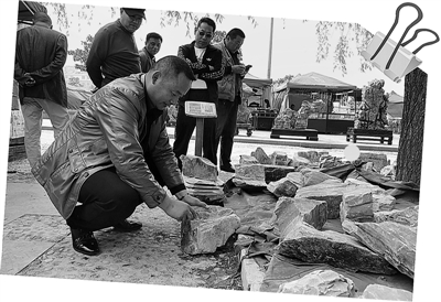4月11日,在市中区文化西路的文化广场上许多市民在挑选石头。据了解,这些石头是长白山区的松花石,松花石造型奇特、颜色繁多,根据品质不同,按每斤3至7元的价格出售,吸引了不少市民前来购买。 (记者 王震 摄)