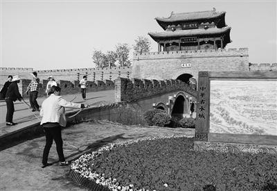 4月16日,台儿庄古城的工作人员在为鲜花浇水。日前,台儿庄古城摆放了众多喇叭花、五色槿等花卉,五颜六色的花卉次第开放,一团团一簇簇,把古城装扮得花团锦簇。