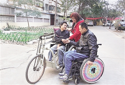 14日,市民武先生(右)探望了一位“特殊青年”。据了解,这位坐在轮椅上的25岁小伙子(左)患有脑瘫,父亲因此抛弃了他们母子俩。武先生说:“一位母亲辛辛苦苦独自把儿子带大,是件非常不容易的事,我决定帮助这母子俩。”武先生也是位残疾人,他却还能将爱心献给弱势群体,让邻居们刮目相看。