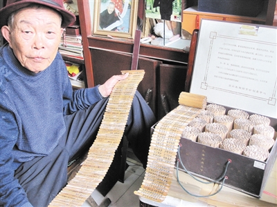 峄城区75岁的田厚德老人,用雪糕棒做成“竹简”,并在上面书写《三字经》等经典著作。据悉,从2006年开始几年下来,他先后完成了《论语》、《唐诗三百首》、《毛泽东诗词全集》、《百家姓》、《三字经》等经典著作的抄写。目前,他正在对已抄写好的《三字经》做最后的装裱处理。 (记者 孔浩 通讯员 苏新伟 摄)