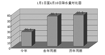 今天,是世界地球日,今年的主题是“珍惜地球资源,转变发展方式”。水,是人类生存不可或缺的资源,春天雨水历来稀少,俗语中更“春雨贵如油”的说法。今年以来,我市似乎也与雨水“无缘”。来自市水利部门防汛抗旱指挥部的消息显示,今年1月1日8时至4月10日8时,我市平均降水量为26.4毫米,较历年同期的57.2毫米偏少53.8%,较去年同期的55.1毫米偏少52.1%。目前,我市旱情严重,但好在对小麦影响并不是太严重,再加上多部门的联合努力,使我市旱情也有了一定程度的缓解。