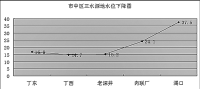 市自来水公司的褚主任向记者展示了一组数据,从今年元旦起至4月15日,市中区平均降雨量为32毫米左右,只有往年同期的三成左右,但水源地水位下降并不明显,具体为:丁东为16.8米、丁西为14.7米、老深井15.2米、肉联厂24.1米、渴口37.5米;去年同期的数据为:丁东29.5米、丁西24.6米、老深井18米、肉联厂24.6米、渴口40.6米。两组数据对比后不难发现,虽然受旱情影响水位较去年同期有所下降,但好在降幅不大,尚在承受范围之内。