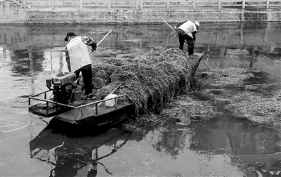 4月20日,环卫工人在台儿庄区环城河道内集中清理河草。为创建省级文明城市,该区执行“早五晚九”的16小时保洁制度,垃圾落地不超过10分钟即有人捡拾。