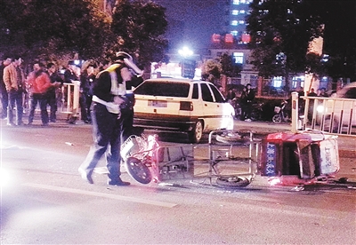4月20日晚8点多钟,一辆白色轿车在光明路上(市立医院南门处)为躲避翻倒的三轮车和老人,而撞到了护栏上。据目击者称,此处是三岔路口,前面的一辆轿车将一名骑三轮车的老人撞翻后疾驰而去,后面的一辆白色轿车见状急打方向,撞到了护栏上。如果三辆车和轿车都开慢点也许就不会发生事故了。