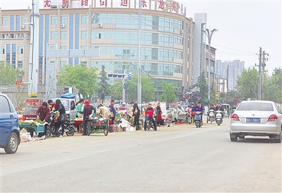 4月23日,在市中区建设路与光明路十字路口南侧,刚修建的建设南路已经基本能通行。但是不少商贩沿着路口做起了生意,不宽的马路俨然成了菜市场,不少市民在路边买菜,增加了交通安全隐患。 (记者 马高超 摄)