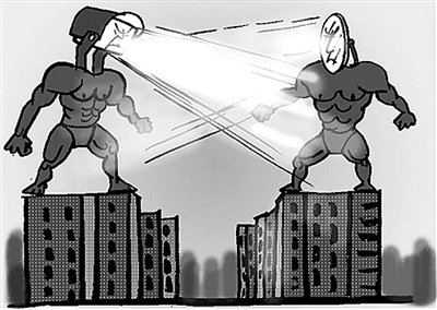 最近,江苏宜兴市中星湖滨城45和50号楼之间因为一家外墙上安装了“照妖镜”,让另一家很不爽,便弄了7盏大射灯,想逼迫对面把“照妖镜”拆掉。于是你挂照妖镜,我亮大射灯,两家人隔空“斗法”,苦了邻居。(5月13日《现代快报》)