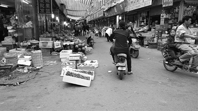 晚报讯 (记者 王龙飞 摄影报道) 在市中区朝阳市场西门,南北两侧的水果店将其部分水果筐直接摆在了路的两旁,原本能轻松允许两辆机动车通过的小道只剩一半的路面供行人通行,每到早晚上班高峰期,此处经常会造成拥堵。据一旁的市民介绍,此占道的水果摊在之前“创卫”时曾经被清理过,不知为何如今又将摊位摆了出来。