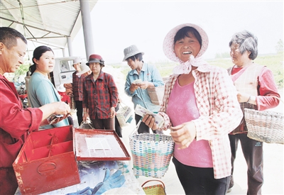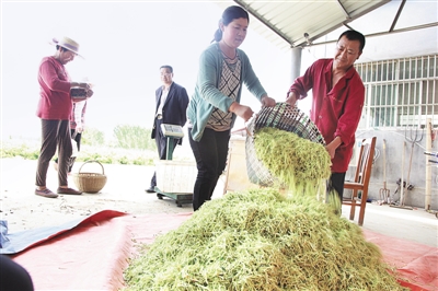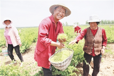 现在正是金银花采摘的季节,李兴亮的300亩金银花基地里,几百名老人、妇女挎着篮子、端着筐子像蜜蜂一样在采花,采一斤挣三块,有的妇女一天就能挣七八十元,而且当场结账,大家都夸李兴亮为家乡做了件大好事。