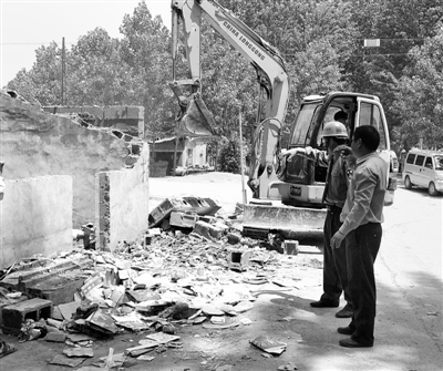 5月18日,台儿庄区路政执法人员用铲车、自卸车等工程机械对该区邳庄镇公路范围内的26处违章建筑物进行了拆除,当天共清理违法设置非公路标志22处,清除乱搭乱建构筑物、建筑物26处,清除路障1600余立方、包培路肩20余公里。 (记者 岳娜 摄)