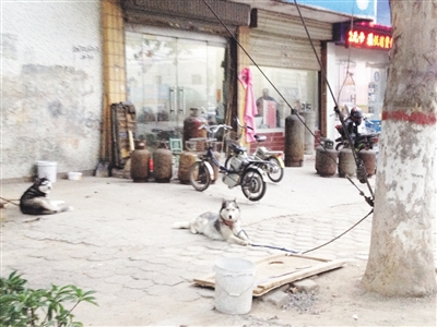 5月19日下午,记者途经市中区建设北路时看到,一家商铺外的人行道上拴了两只狗,过往的行人不仅不敢走人行道,就是从马路上经过的时候也是离的远远的,怕狗狗突然蹿出来,伤了自己。