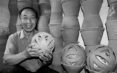 土陶是我国先民早期的传统工艺,是流传至今的珍贵稀有非物质文化遗产之一。土陶分为祭祀、赏玩及生活用品三大类。平安吉祥球是属于赏玩类土陶的一种,制作工艺较为复杂。今年64岁的台儿庄区泥沟镇夹坊村的魏延年便是当地平安吉祥球的传承人。