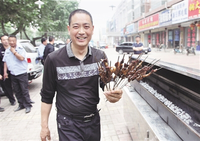 5月19日,市中区君山路旁,一位烧烤业主拿着刚烤好的肉串说,“瞧,这肉串是用无烟净化烧烤炉烤出的。”据悉,在市中区城市管理部门的帮助下,该业主引进的新型无烟净化烧烤炉,净化率达98% ,下一步,市中区主要干道的70多家烧烤业主将陆续换上无烟净化烧烤炉,减少烧烤带来的污染。
