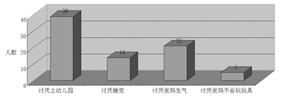 在接受采访的50名学龄前儿童中,39名表示最讨厌上幼儿园,14名讨厌睡觉,21名讨厌爸爸妈妈生气的样子,5名讨厌爸爸妈妈不会玩自己的玩具,还禁止他喜欢奥特曼和其他国外的动画片。一名小朋友说,他最讨厌的事情就是睡觉,因为睡觉会减少他玩游戏的时间,这让他非常不开心。