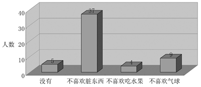 随着年龄的增长,到了小学五年级,不少孩子逐渐有了自己的想法和主见。在59名五年级学生的调查问卷中,有5名孩子表示没有什么不喜欢的,37名则写出不喜欢垃圾、虫子等脏的东西,4名孩子写的是不喜欢吃水果。不过奇怪的是,孩子们普遍喜欢玩的气球,却被9名孩子列入了最不喜欢的事物当中。