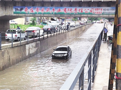 5月31日晚,一场大雨袭来,在市中区建设北路(石岭路)铁路往北的涵洞内积满了水,涵洞两头的车辆“寸步难行”,纷纷排起了长队。记者发现,涵洞一侧的辅道有工作人员正在现场钻孔排水,不少车从涵洞的辅道通行,因路窄车多,过往车辆排起了 “一字长蛇阵”。在现场,一辆黑色轿车欲从涵洞下通行,在行驶至积水最深处时抛锚,车牌也被积水冲掉。