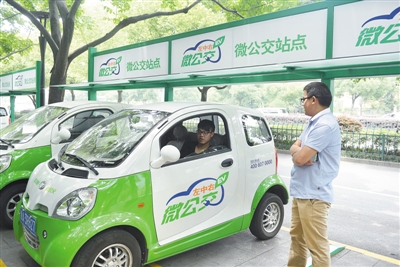 日前,浙江杭州纯电动微型汽车“微公交”的第一家路边租赁站点在杭州古荡天目山路投入使用。站点有专人值守,每个车位配有插座,市民可以像租公共自行车一样租电动汽车。“微公交”是一种“纯电动汽车分时租赁”业务,于2013年10月正式投入运行。人们以小时为单位租用汽车的使用权,可以在一个租赁点租车,开到城市的任何一个网点还车,再供其他用户使用。