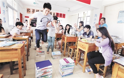 昨日,福建晋江市荆山外来工子弟学校高三学生在玩考前减压游戏。今年该校将有78名学生结束返乡高考的历史,就地报名参加普通高考,享受与本地考生同等的录取政策。
