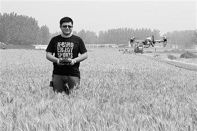 近日,滕州市丰裕种植专业合作社的创业青年刘福琛花费数万元购买了无人飞行器用来三夏防火。这是滕州市第一架用来监控防火的飞行器,上面装有高清摄像头,可以GPS空中定位,能用无线图传系统进行传输观看,飞至200米高度时,能看到方圆1000亩田地的防火状况。 (特约记者 王雪纯 摄)